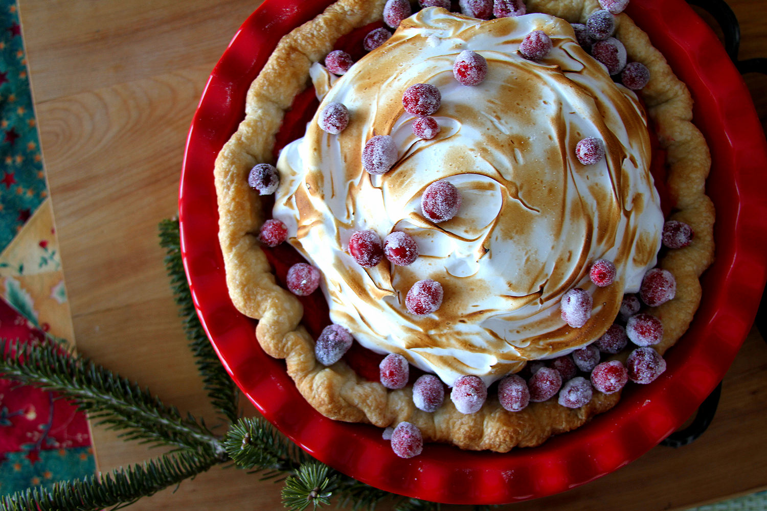 Every year at Christmas, I try to make a fancy dessert, and while a meringue pie isn’t all that fancy, it is a little more effort than an ol’ apple pie. So for this year, I made a Cranberry Meringue Pie, seasonally appropriate, I suppose, with candied cranberries. Very pleased with the outcome. Tart and sweet — and the sugared cranberries add a nice pop — and the meringue is very silky. It does take a bit of time to let things cool in between steps, but I think it’s worth it.
