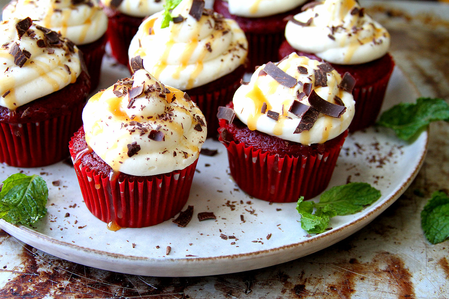 Red Velvet Cupcakes with White Chocolate Cream Cheese Frosting + a Sea Salt Caramel Drizzle