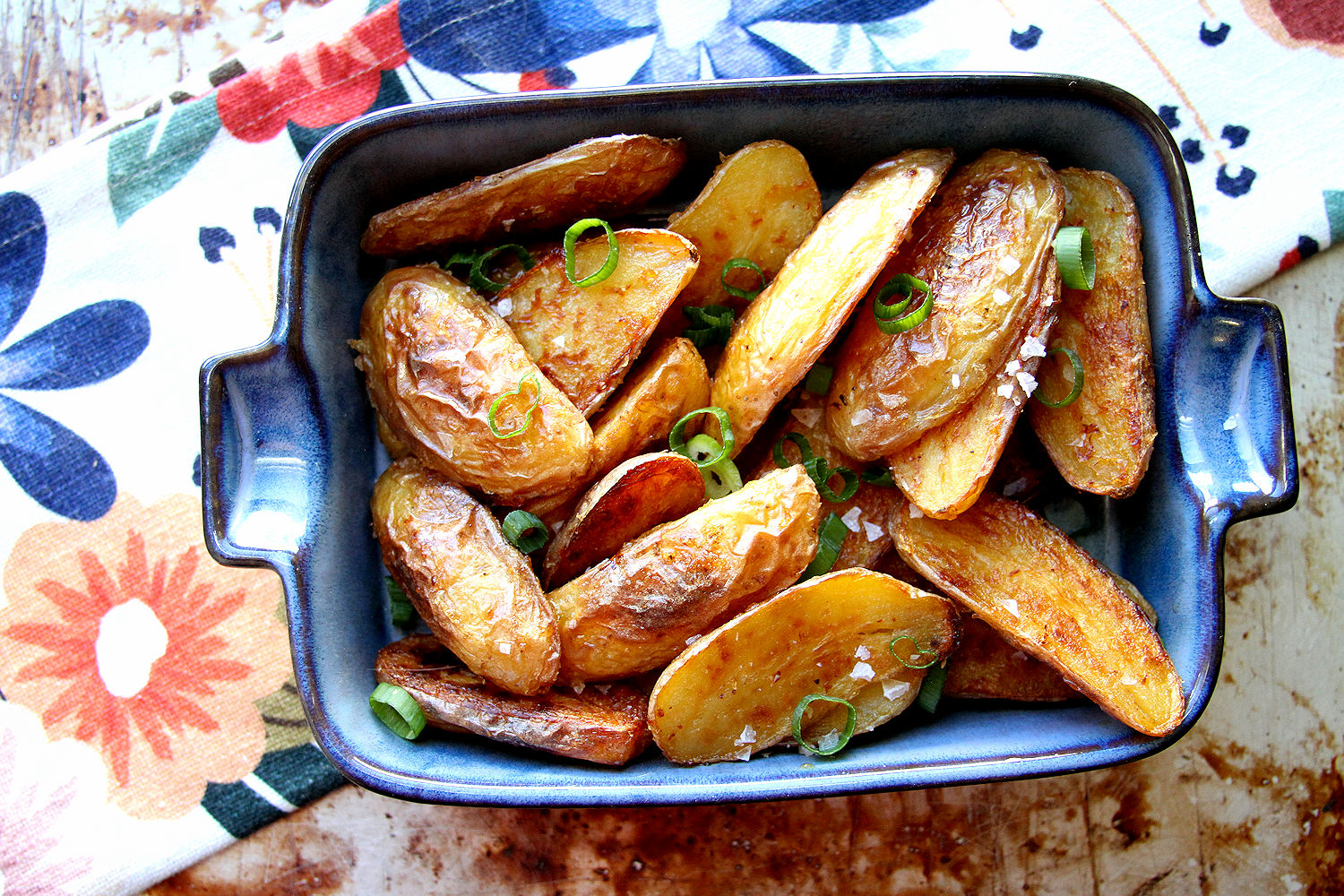Potatoes. Spuds, Taters. And in this case, roasty, buttery, fluffy on the inside, crackling on the outside fingerling potatoes.