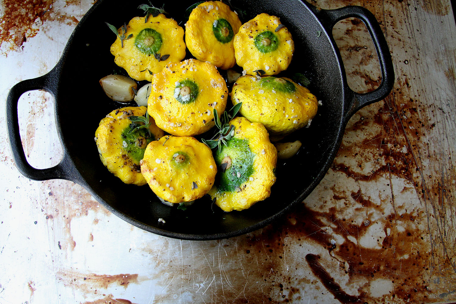I call Patty Pan squash UFO Squash. Or Alien Squash. Or simply mutants. They are similar to summer squash or zucchini and you can actually prepare those types of squash the same way as this recipe. This made a great side dish to fish this evening but also pairs well with chicken or red meat, or simply on it’s own, I guess. Aim to buy smaller patty pans, or cut them in half, which I don’t think is as pretty. Really easy peasy recipe.