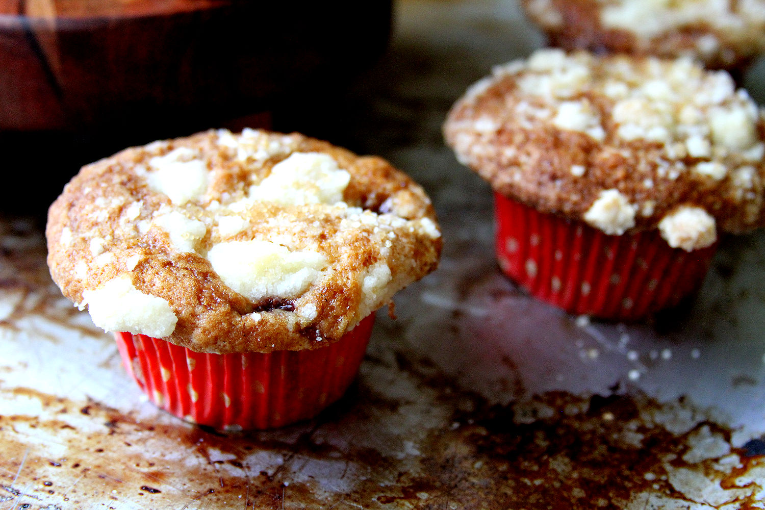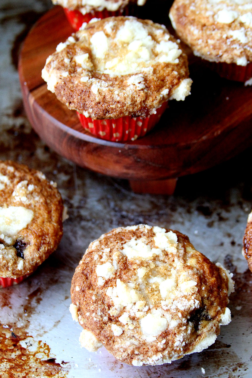 To make streusel topping: Mix together sugar, flour, butter, and cinnamon. Mix in the butter with fork until it looks like coarse sand. Set aside in the fridge.