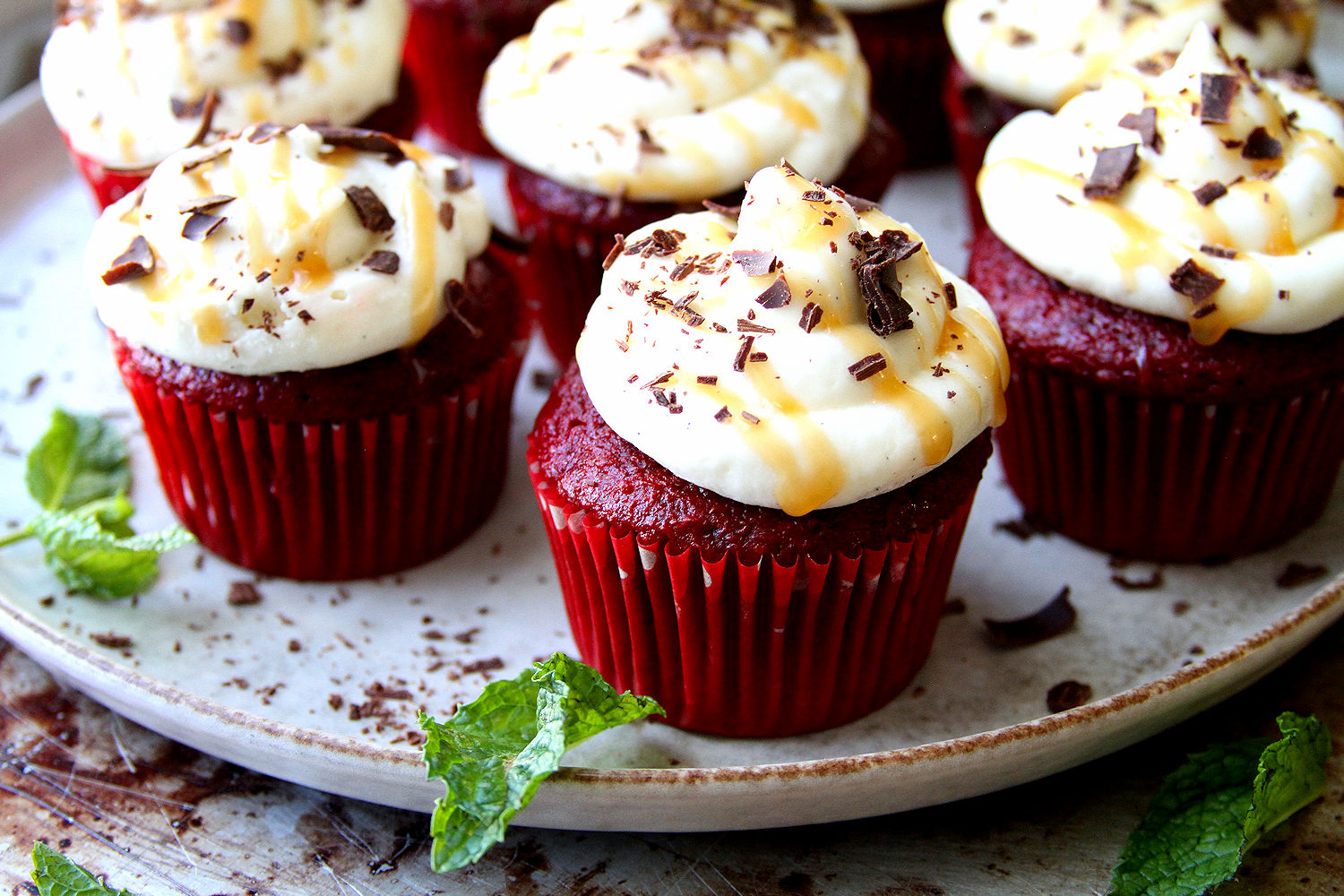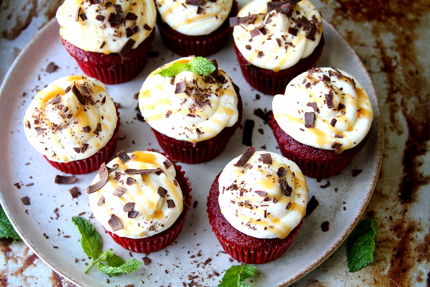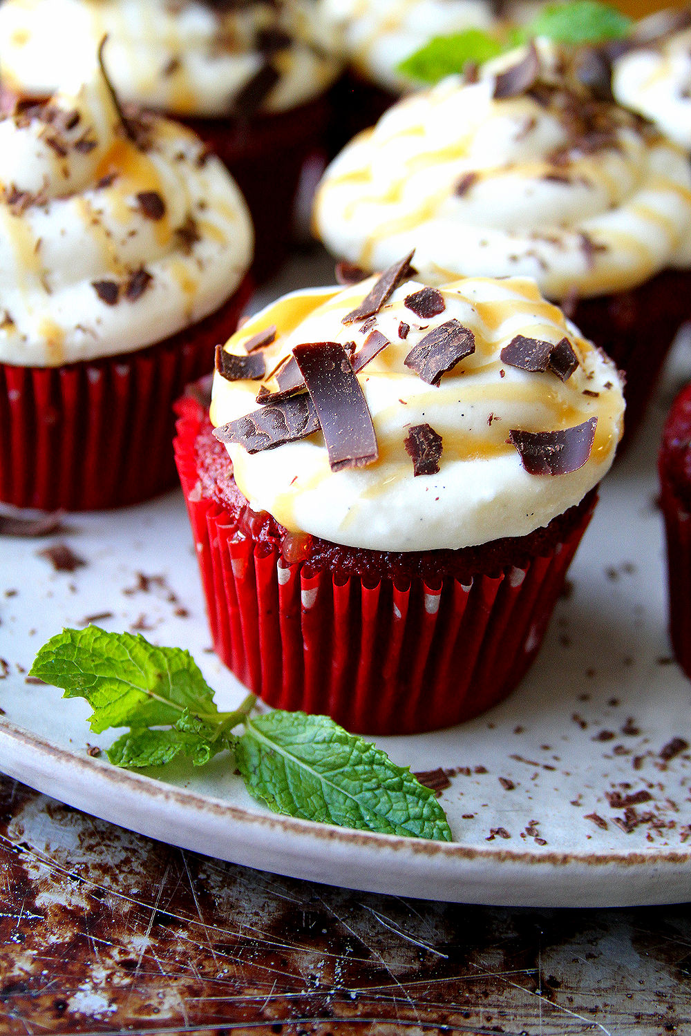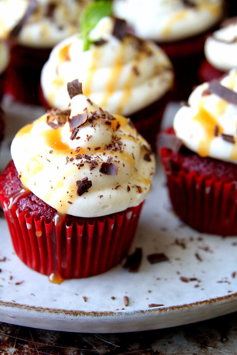 It’s my best friend’s birthday weekend and pretty much every year, she asks for Red Velvet “something” — from cake to cupcakes to whoopie pies. This year, I went back to the cupcake plan, but went a bit overboard with the white chocolate (which she also loves) cream cheese frosting, topped with an over indulgent a sea salt caramel drizzle, Yum. Too bad that she actually won’t get these cupcakes for her birthday, because my car ended up at the repair station on Friday afternoon and won’t be ready until Monday, so I ended up not at her place, but I’ll remake them next week hen I see her again and in the meantime, the mechanics at the shop will get a nice treat when I pick up my Volkswagen
