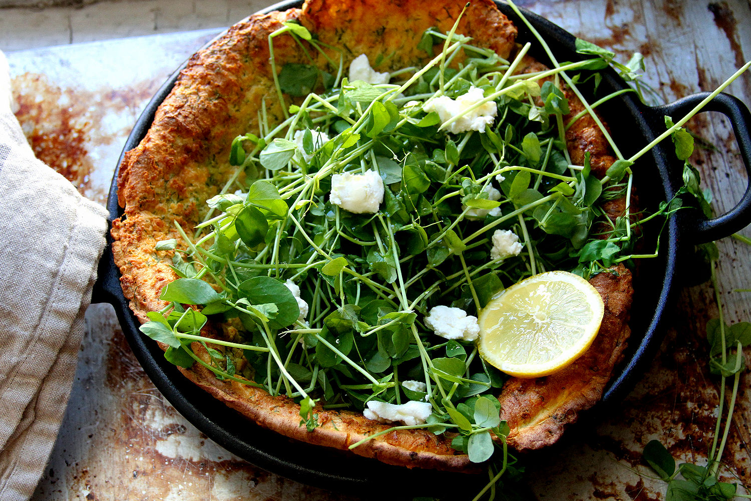 Allow the puff to cool slightly in the pan, approximately 5 to 6 minutes. Top it with tender greens and dill fronds. Spoon the remaining goat cheese on top and drizzle with honey and 1 tablespoon of olive oil. Slice the lemon and squeeze a wedge over the greens and serve immediately.