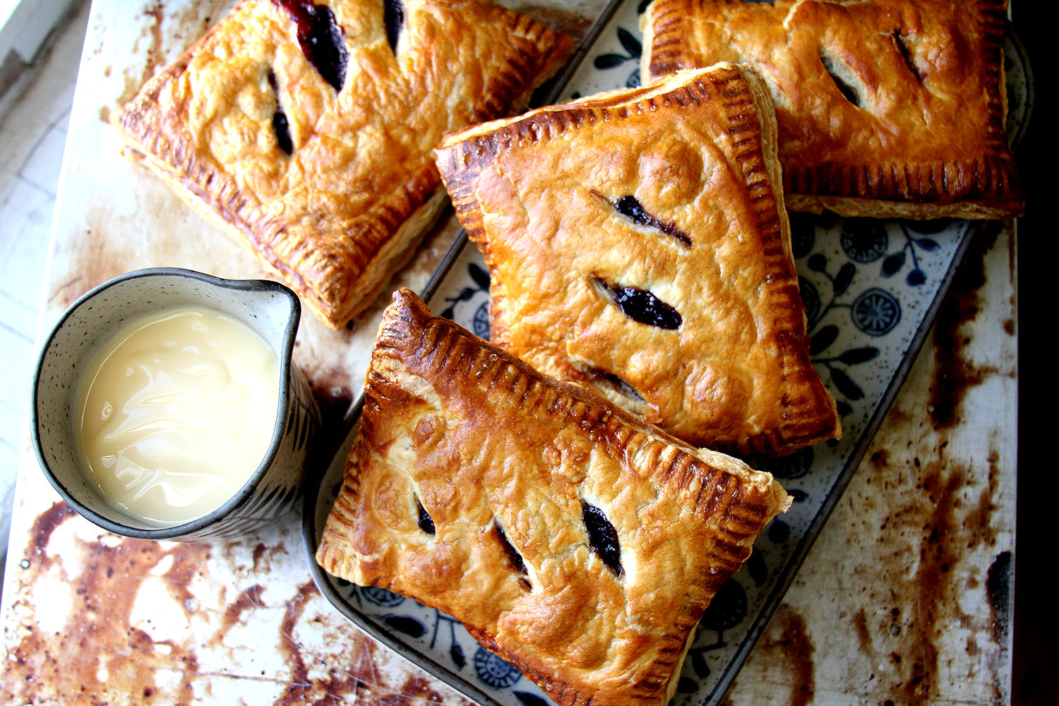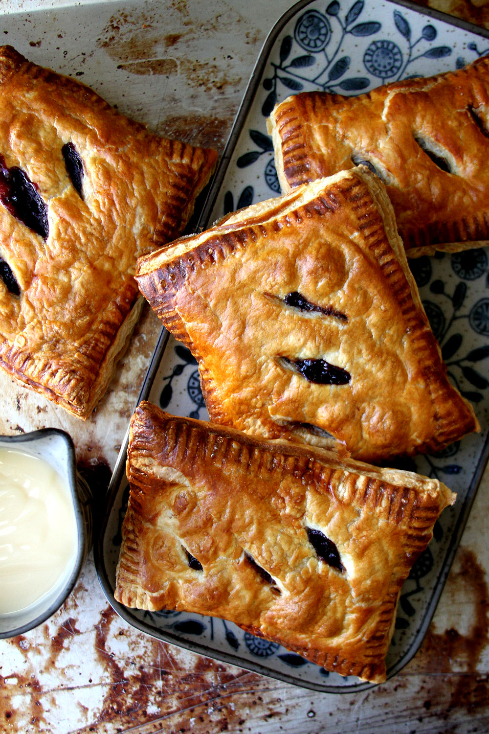 On a well-floured surface, unfold one piece of puff pastry sheet. Using a floured rolling pin, roll the sheet into a 10-inch-wide by 12-inch-long rectangle. Using a sharp knife, cut into four equal-sized rectangles (these will serve as the bottom half of each pie). Repeat with the remaining piece of puff pastry and set aside. Set the bottom pastry rectangles on the parchment-lined sheet pan. Distribute the filling evenly into a thick, even layer onto the bottom half of each pastry rectangle, leaving a 1/2-inch border on all sides. Brush the borders lightly with the egg wash.