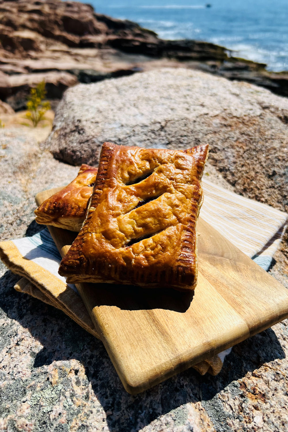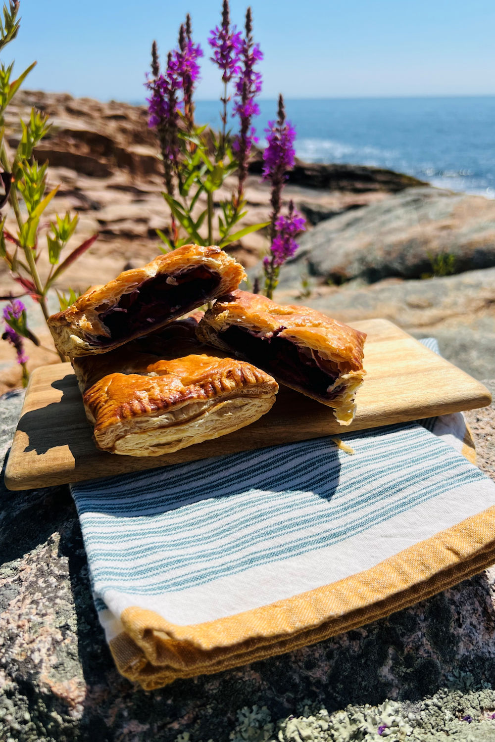 As many of my friends and followers know, almost every time I go home to Germany, I go with a friend to Innsbruck, Austria to a very specific cafe for strudel. Yes, that strudel is that good. Well, it is also a good excuse to go on a road trip, but yeah, the strudel is perfection. Last week, he had the occasion whilst on his holiday in Austria to go to Cafe Kroll and in a fit of jealousy, today I baked my own strudel and went on my own little road trip to Cape Ann, here in Massachusetts, with my strudel in tow. Not quite the same and it’s really faux strudel because I used puff pastry instead of strudel dough, but it’s the thought that counts I suppose. It’s “wild berry rhubarb” which just means mixed berries — raspberry, blackberry, blueberry and rhubarb. Delicious and strudel craving sorted until the next Munich trip.
