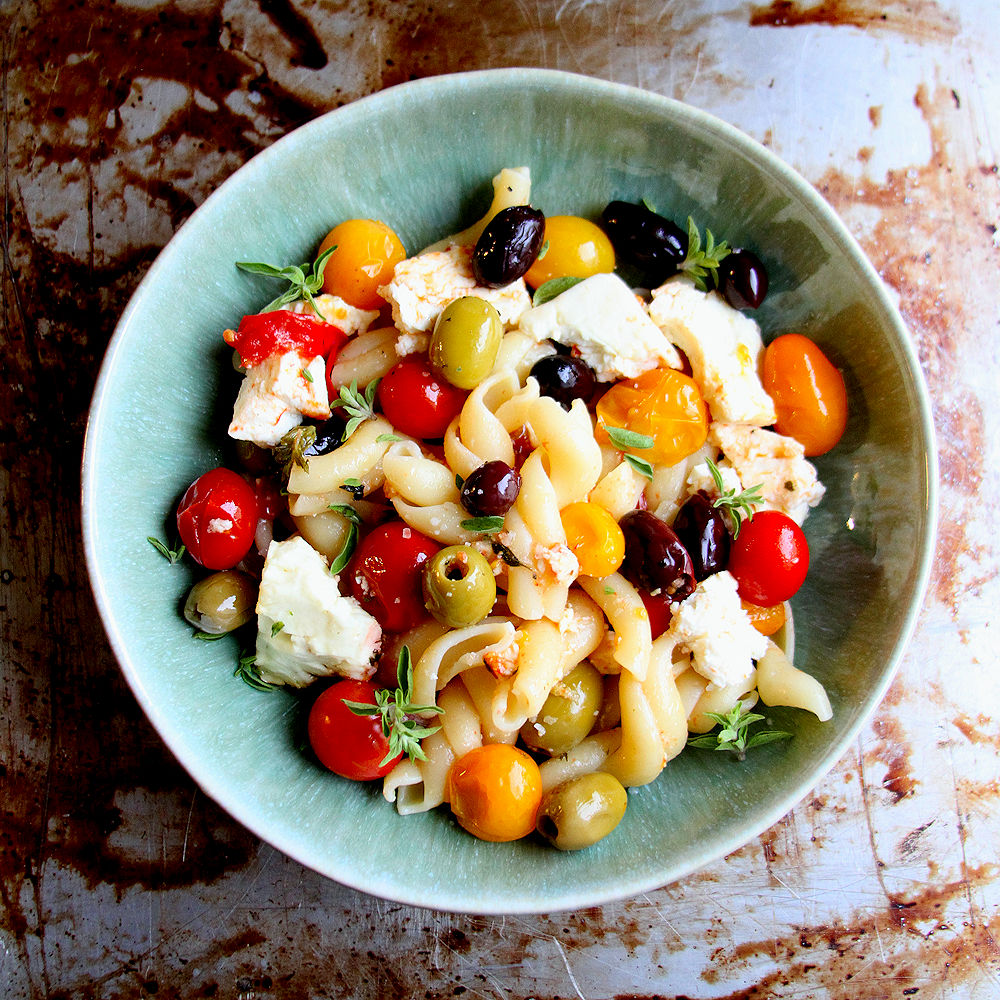 I didn’t have a lot of time yesterday evening, but I did have pasta, cherry tomatoes, olives and feta in the house, so I threw this little combo together and it turned out yummy enough to turn into a recipe. Sometimes “winging it” turns out to be pretty good. On the table in under 30 minutes.