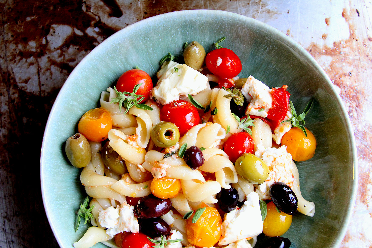 Add the cooked pasta, and the olives to the pan and toss to combine. Taste for seasoning and adjust salt as needed. Garnish with the remaining fresh oregano and serve.