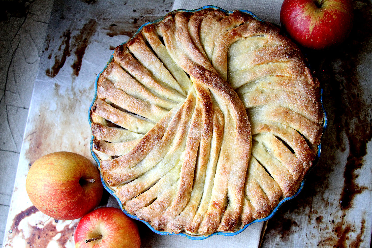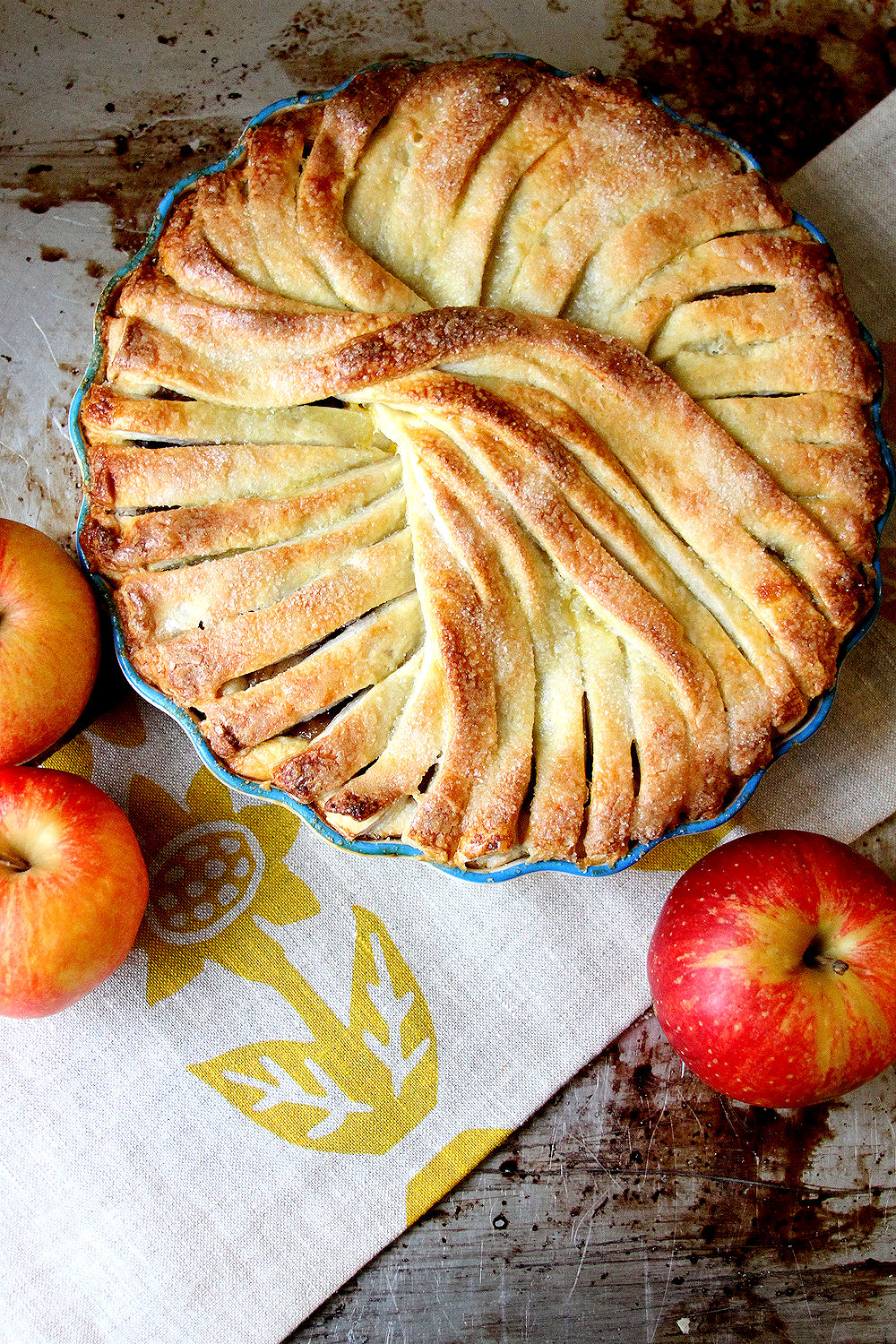 On a lightly floured surface, roll out the first pie dough to a 12-inch circle. Place the first round into a 9-inch pie plate, pressing down into the edges. Place the apples into the pie plate, mounding them towards the edge a bit (as you can see from the photo, there is a big, overlapped bit of dough bit in the center. If you don’t put a little bit of indentation in the apples, it will rise up pretty high). Roll out the second piece of dough to a rectangle where one edge is at least 11 inches. Cut very narrow strips, less than 1/4 wide. Lay strips close to another (or even touching) in a circle. They will overlap and create a “swoosh” by themselves as you lay them on the pie. Once completely covered, seal the edges by pinching them together and folding them over. In a small bowl, whisk together the egg with a tablespoon of water. Brush over the pie dough. Sprinkle with granulated sugar, if desired. Chill pie for at least 1/2 hour before baking, particularly if the dough has softened.