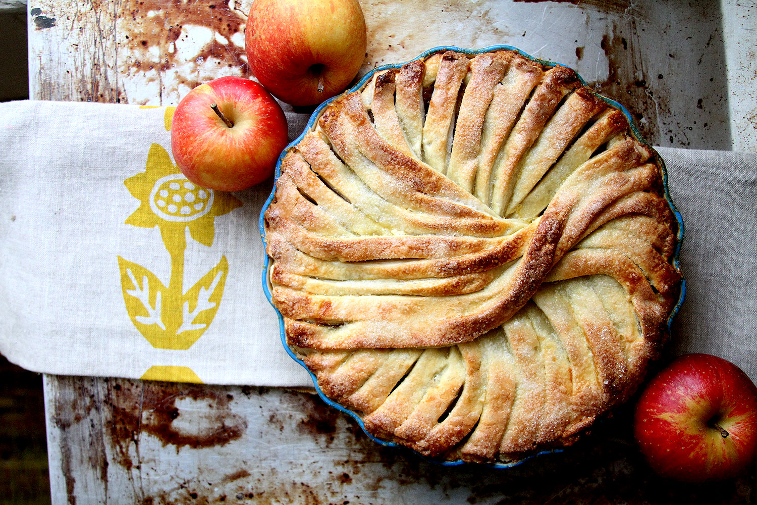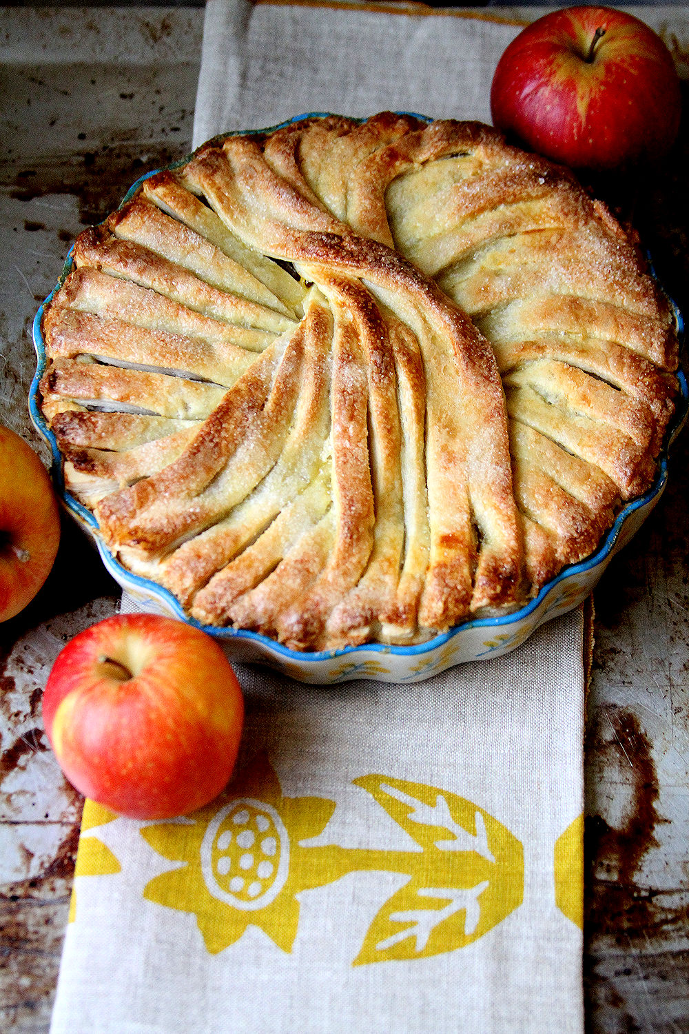 As I mentioned the other day, autumn is for pie! As we head toward Thanksgiving in the US, here is another example of a pie that y’all could investigate for your own dessert tables: Crispin Wave Apple Pie, using Crispin Apples. To be honest, I am using more of a Pink Lady, Honey Crisp or even Granny Smith baker when it comes to pie, but I was pleasantly surprised by these Crispins. Held their shape; a little sweeter than most of my apple pies. The wave design sort of happens by itself as you pinwheel the narrow strips of pie dough around the top. Break out the vanilla ice cream!