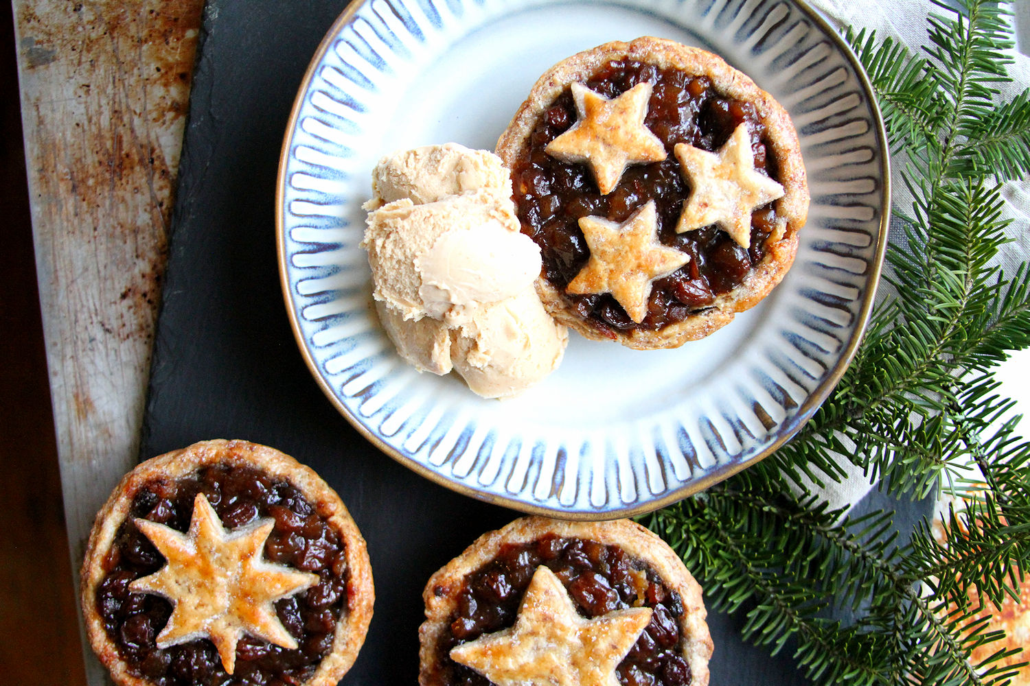 I didn’t think that I would be a mincemeat person. I mean, I like raisins and dried fruit on the whole — and my recipe has raisins, sultanas, dates, apples and even a bit of dried apricot in addition to the candied lemon and orange — but I didn’t think that I would like it as much as I do. The reasons are two fold: I added candied pecans (crushed to powder in the MagiMix) to add a amazing nutty note to the crust, but 2. most importantly, serving it was gingerbread ice cream. That definitely cut the sweetness and made this the perfect Christmas dessert.