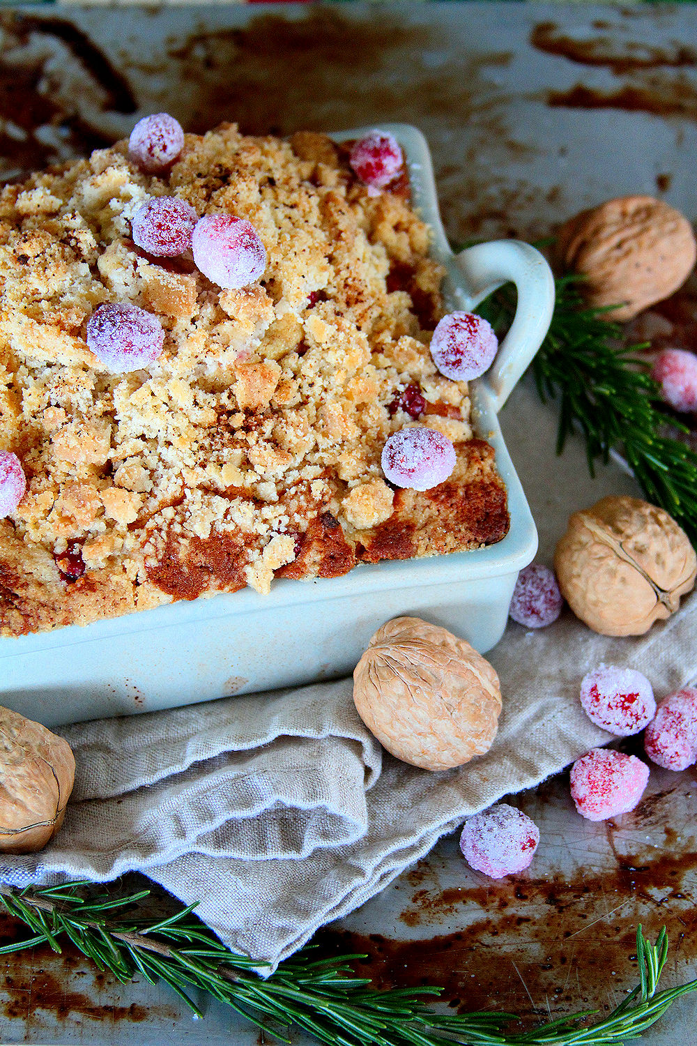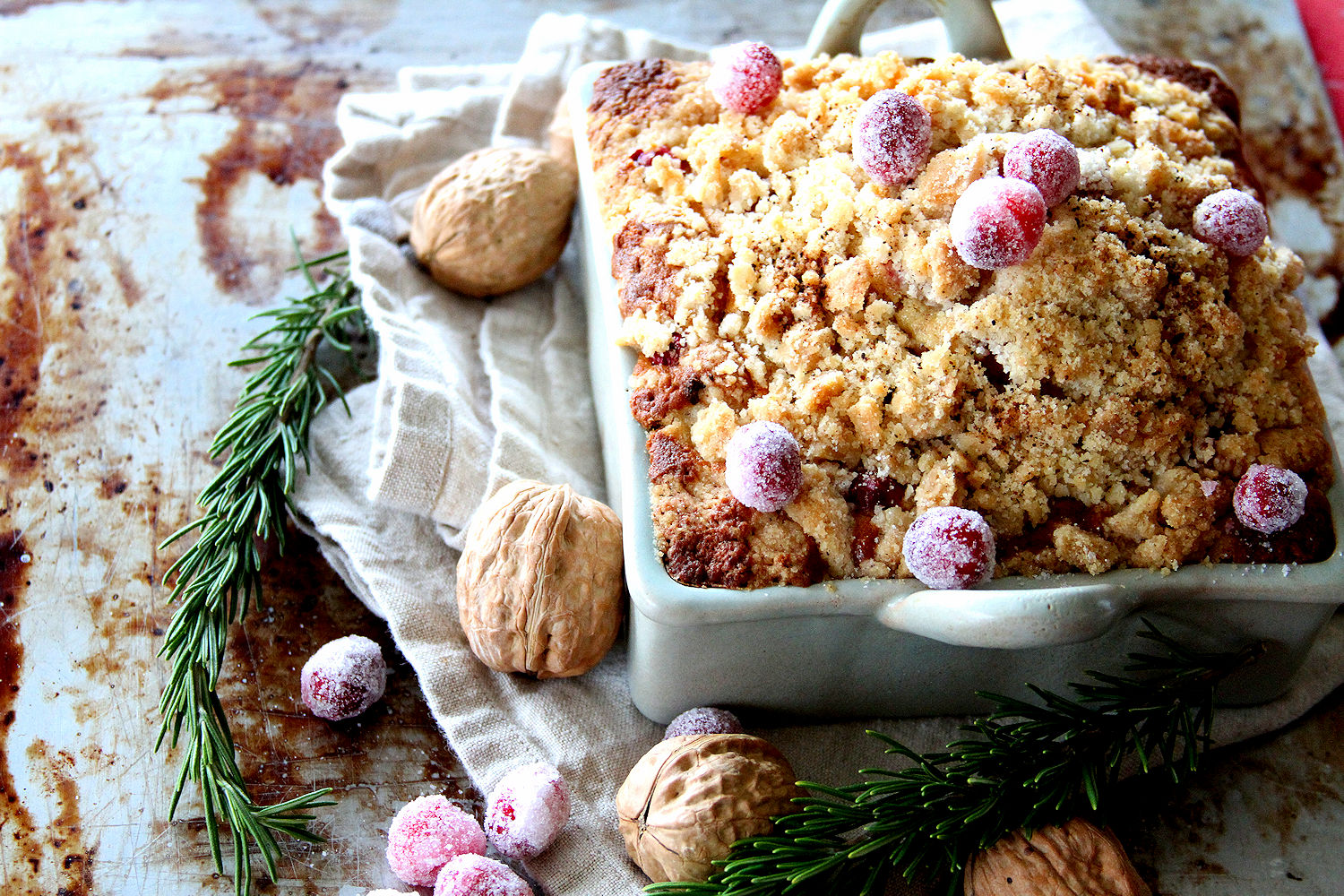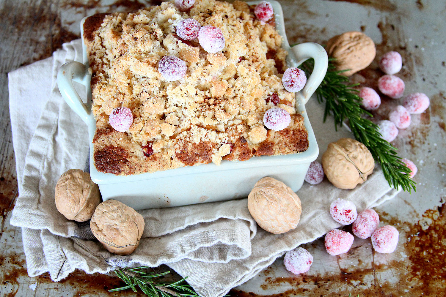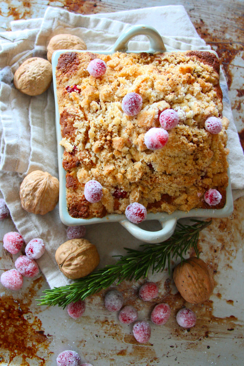Pour the batter into the prepared pan(s) and smooth the top. Spring on the streusel topping. Place in the oven and bake for 50 to 60 minutes. The cake is done when the top is domed and golden-brown, and when a toothpick inserted into the middle comes out clean. Let the cake cool in the pan for 10 minutes, then lift it by the parchment paper and transfer to a cooling rack. Remove the parchment. Sprinkle with the sugared cranberries and serve.