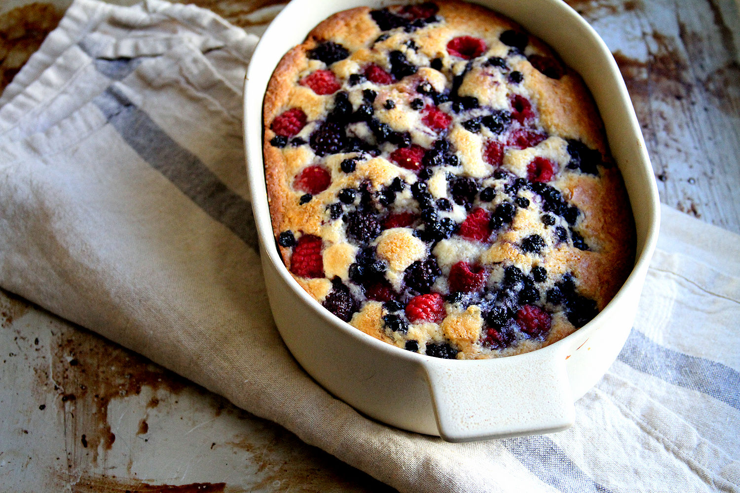 I also don’t really know when to eat it. It would be a great afternoon tea or coffee thing. It would be a great dessert thing with some ice cream and it would even make a fantastic breakfast casserole with maple syrup. So, I guess that is up to you. It comes together in a flash with mostly pantry ingredients: sweetened condensed milk, milk, butter, flour, baking power, salt and a touch of vanilla for the base. I used mixed berries, but you could also use just one berry type, or cherries or even chopped up peaches. Frozen berries / fruit work great here (bake 10 minutes or so longer) and best of all, it isn’t overly sweet.