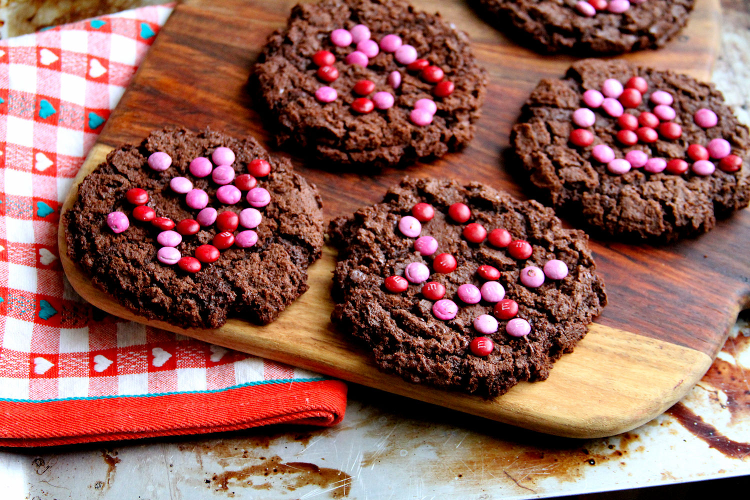 I’ve gotten to be pretty known for my “Biggie” cookies — the oversized, deli-style cookies as big as your hand. So I decided to make a rile chocolate variety of them to include with the Valentine’s Day set. As with the others, these are huge (about 4-4 1/2 inches in diameter), both crunchy on the edges and gooey in the middle. The M&Ms didn’t still particularly stick well so when I make these in the future, I think that I will still with White Chocolate Melting Wafers as the decoration.