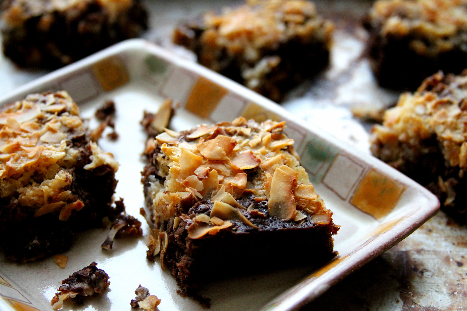 Yep, it’s blowing a gale outside but inside, it’s warm, cozy and smells like the most decadent chocolate and tropical coconut ever. I’m happy that the small lingers because I actually made these Toasted Coconut Double Chocolate Brownies before work this morning because frankly, I thought we’d lose power and internet this afternoon, but so far, we’re doing ok. There is a LOT (a lot, a lot) of snow falling, but that is ok. Digging out my car tomorrow won’t be much fun, but that’s what living in New England is all about.
