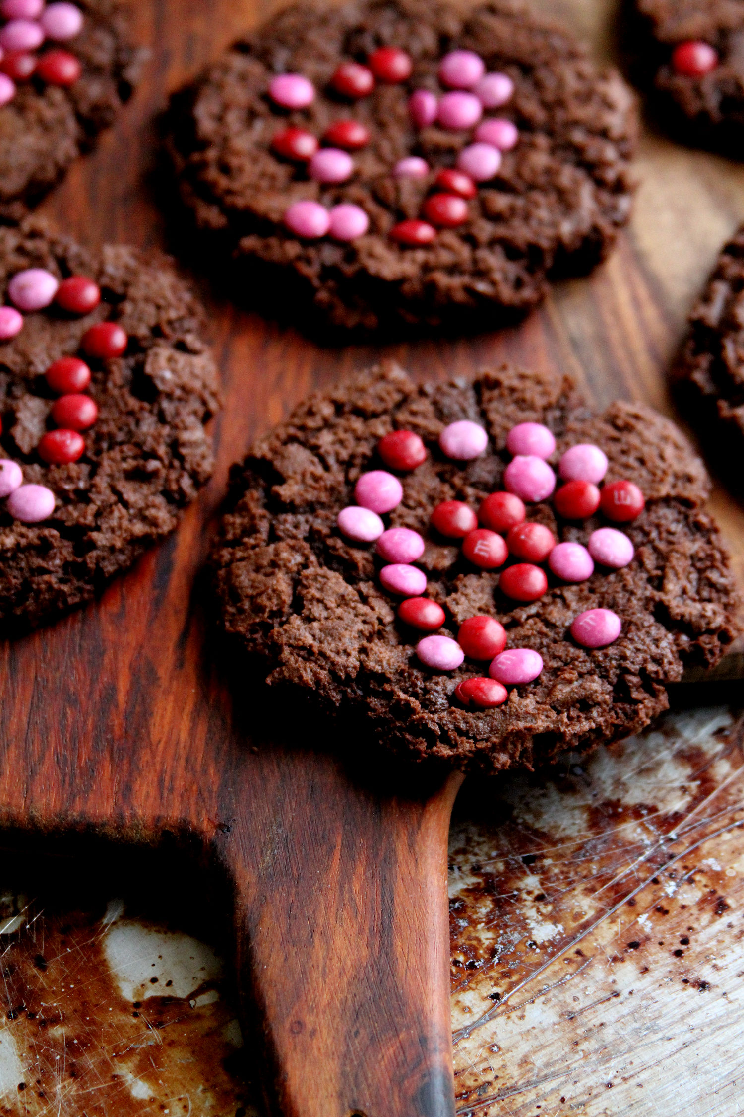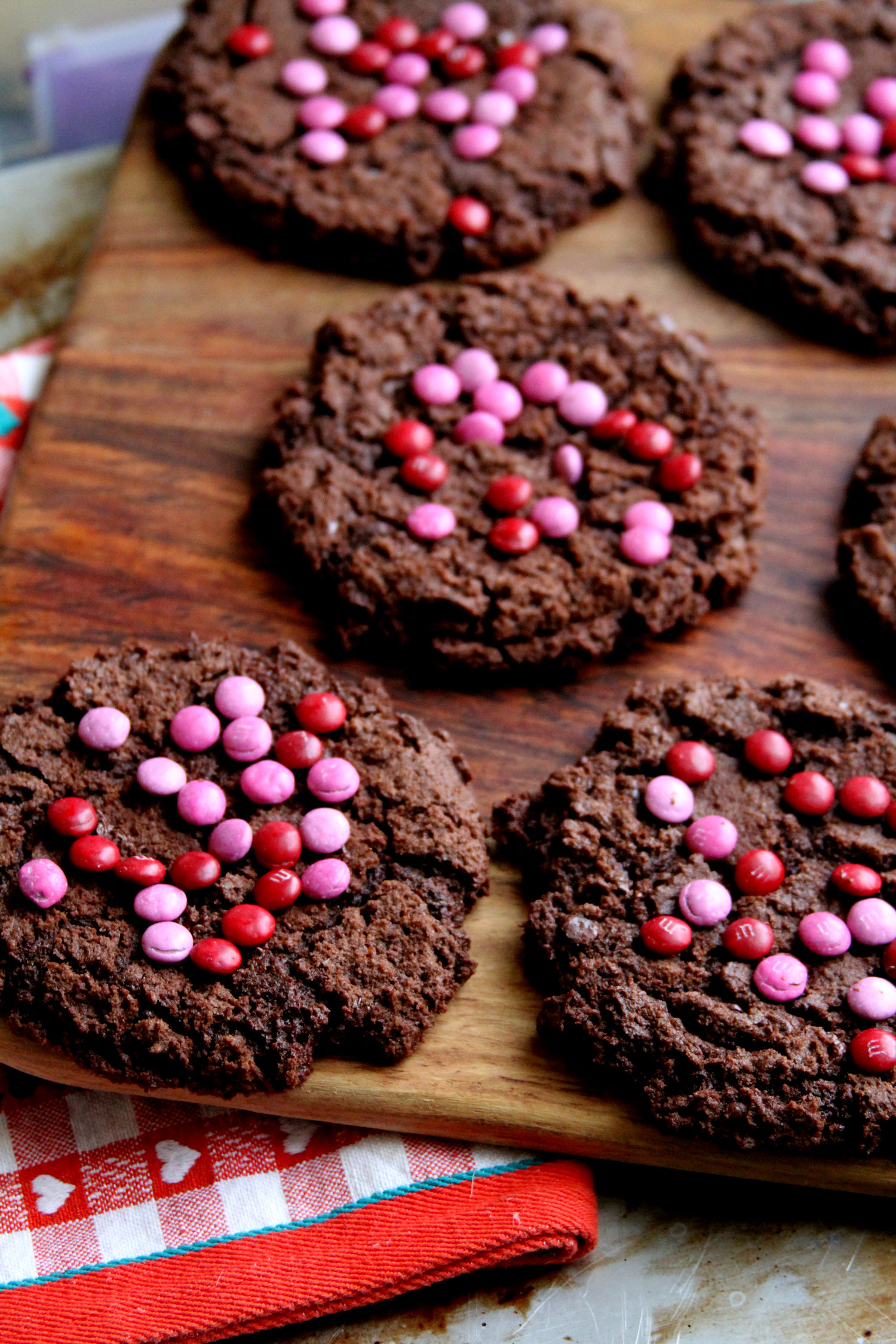 I’ve gotten to be pretty known for my “Biggie” cookies — the oversized, deli-style cookies as big as your hand. So I decided to make a rile chocolate variety of them to include with the Valentine’s Day set. As with the others, these are huge (about 4-4 1/2 inches in diameter), both crunchy on the edges and gooey in the middle. The M&Ms didn’t still particularly stick well so when I make these in the future, I think that I will still with White Chocolate Melting Wafers as the decoration.